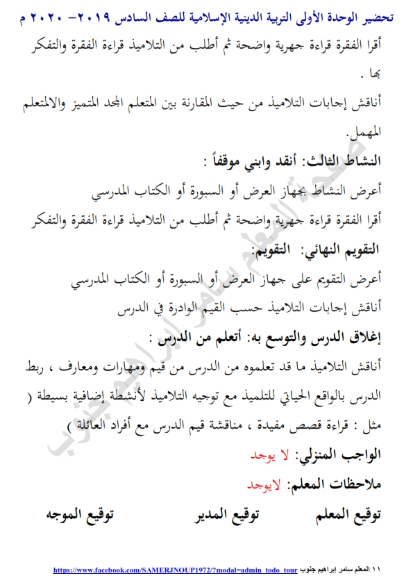 تحضير الوحدة الأولى التربية الدينية الإسلامية للصف السادس 2019- 2020 م الفصل الاول ( المعلم سامر إبراهيم جنوب ).