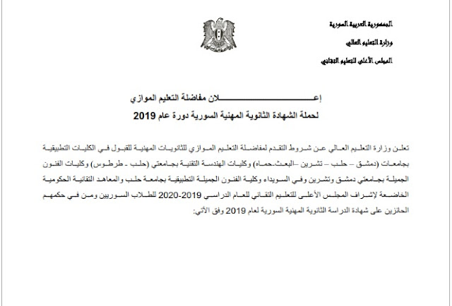 اعلان مفاضلة التعليم الموازي لحملة الشهادة الثانوية المهنية دورة 2019-2020
