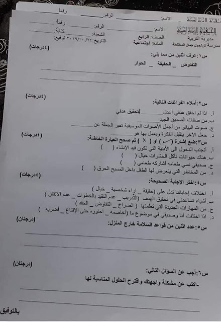 نموذج مذاكرة في مادة الاجتماعيات للصف الرابع من الفصل الدراسي الاول للعام الدراسي 2019/2020 مدرسة جول جمال المختلطة في التل.