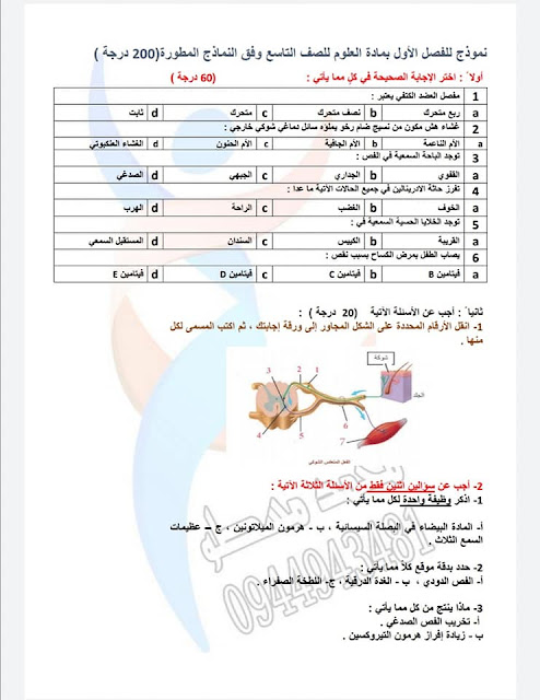 نموذج امتحاني بمادة العلوم للفصل الدراسي الاول للصف التاسع من الفصل الدراسي الاول من العام الدراسي 2020-2021 وفق مناهج سوريا.