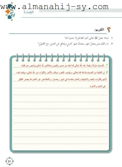 يمكنك تحميل نسخة PDF من حل درس الصيام في التربية الدينية الاسلامية للصف الثامن من الرابط التالي علي مدونة المناهج السورية.
